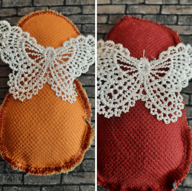Materials: Upcycled fabric samples, lace, and hand-stitched embellishments.