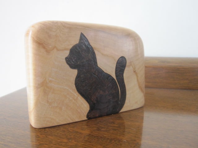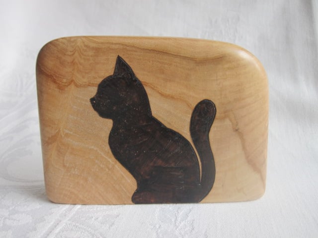 A lovely piece of spalted sycamore measuring approx. 10.5cm x 7.5 cm x 2 cm and weighing approx. 95g with a cat design. The cat is burnt on using a pyrography pen. This little ornament would make a lovely gift for men and women of all ages.