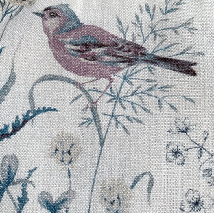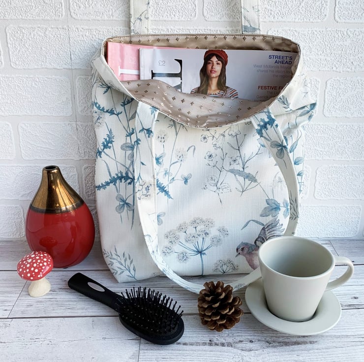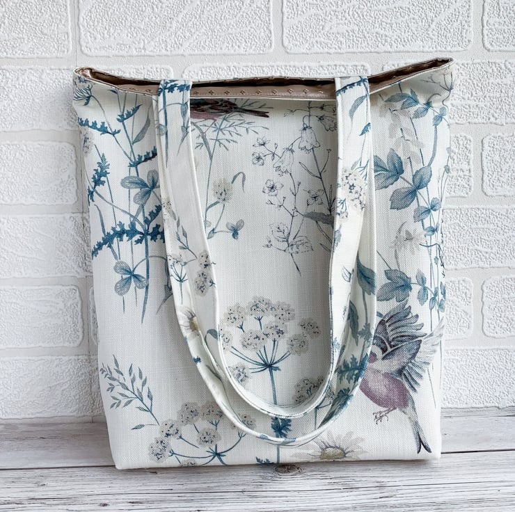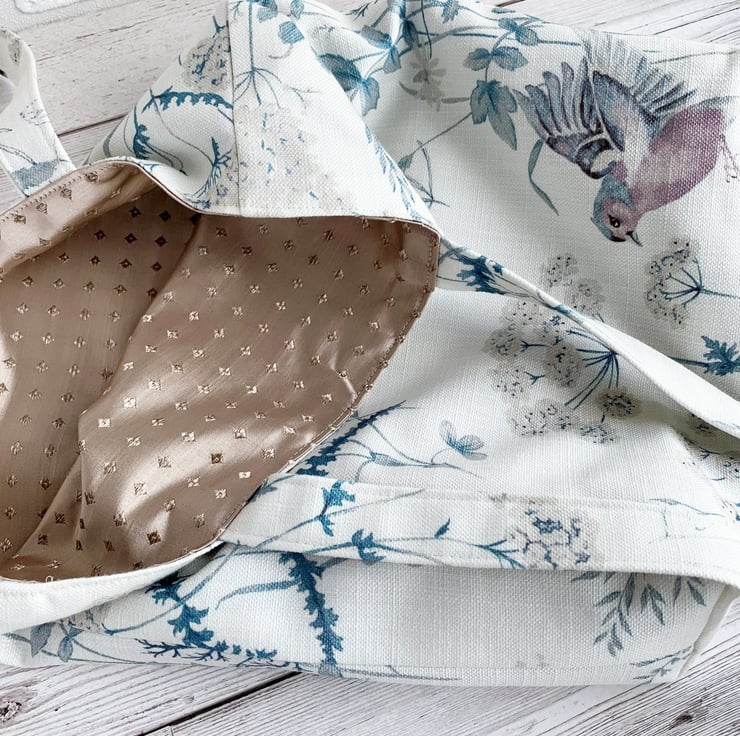 Tote bag with chaffinches in wild flower meadow. This delightful tote bag is made from fabric with a pastel print pattern on a cream background. The pattern shows two lovely blue-grey and dusky pink chaffinches in a wild flower meadow. The plants are depicted in pretty pastel shades of blue, blue-green, cream and golden yellow, and include cow parsley, white clover, grasses and ox eye daisies. The bag is lined with lovely rose gold satin with a woven pattern of tiny diamonds.
