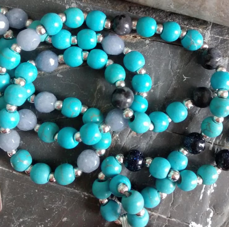 The pendant can be provided suspended from a 46cm necklace of dark purple, green and blue iridescent glass beads interspersed with tiny silvered glass beads or a 46cm necklace of 4mm turquoise howlite, blue goldstone and dyed jade gemstone beads. Alternatively, it can be sent on a plain 46cm silky black cord, a 46cm silver coloured chain, or no necklace so that you can add it to your own chain. Please choose from the drop-down menu.