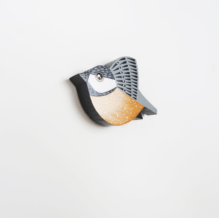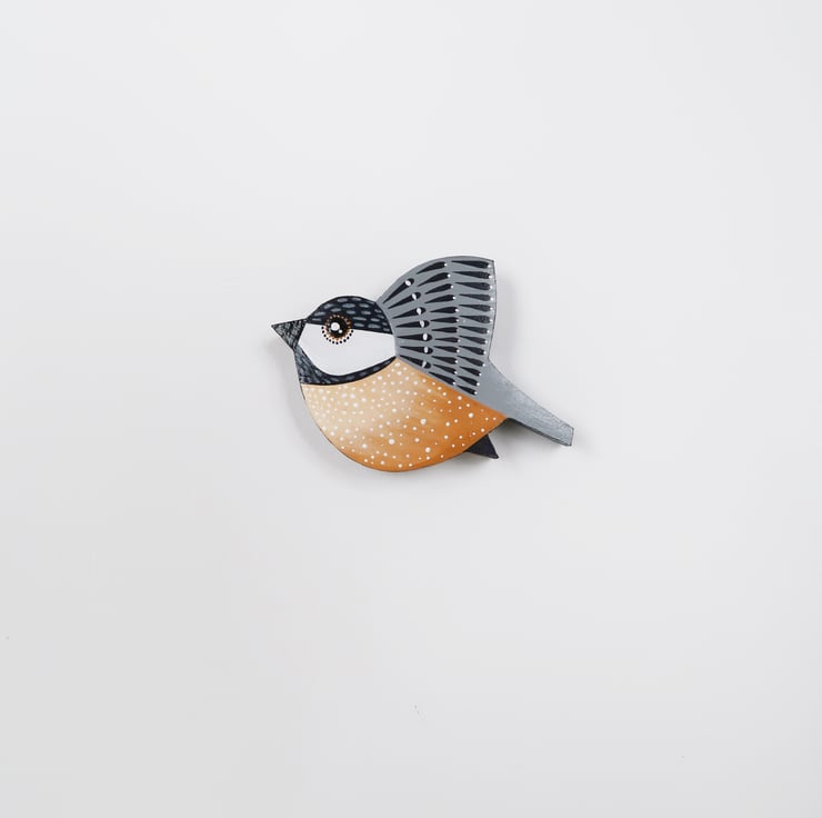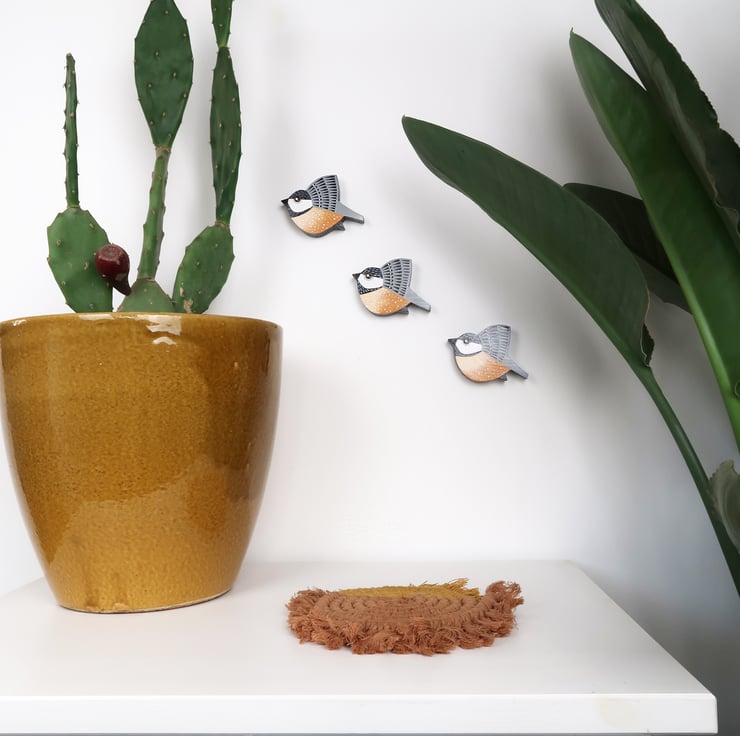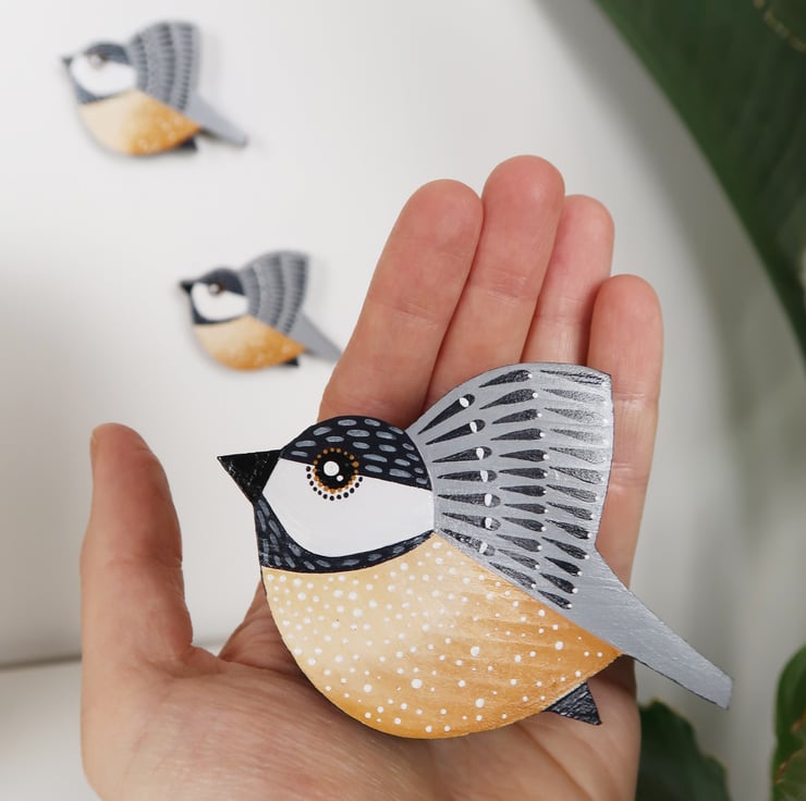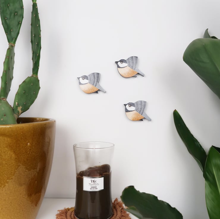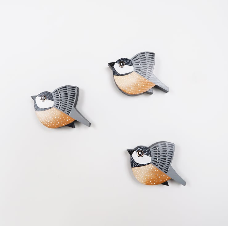 Beautiful wooden COAL TIT bird wall decoration. Set of 3 little birds.