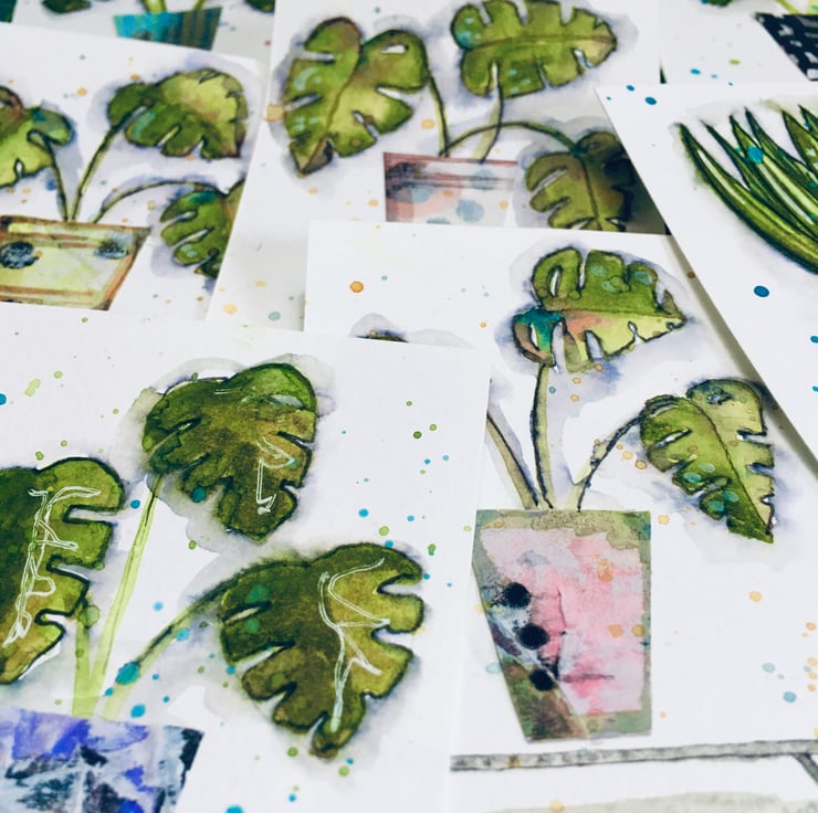 Working with watercolour and hand painted collage papers I have made an ACEO size (2.5” x 3.5”) miniature painting of a fabulous house plant. ACEO paintings a great way to collect work by artists and because of their small size this makes them affordable. They look super mounted and framed and would make a lovely and original gift.