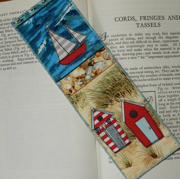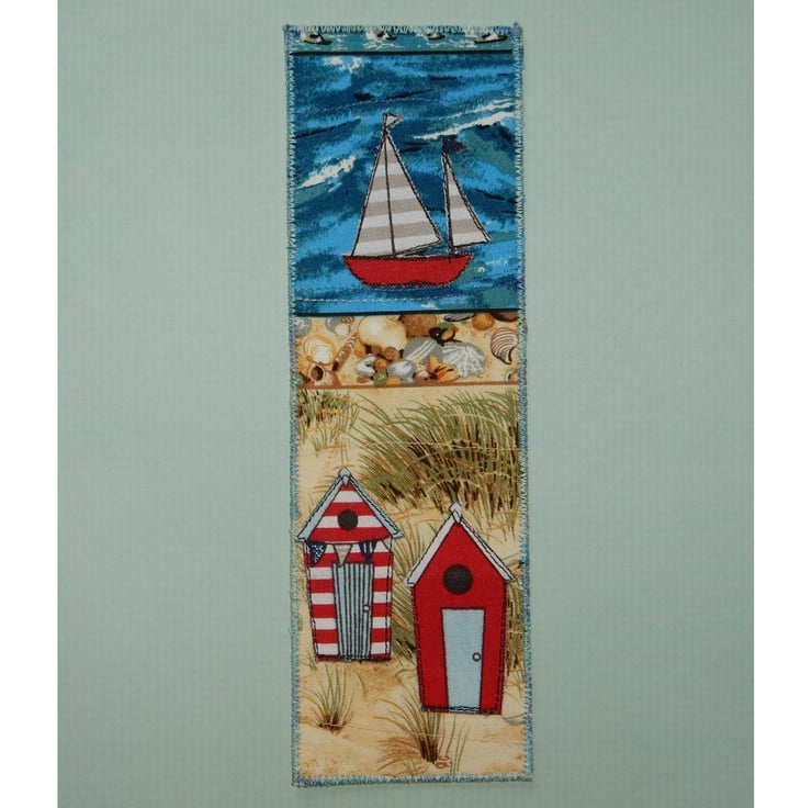 If you can't make it to the seaside, you can still dream of it. With beach huts on the sand dunes and a boat sailing by, this bookmark measures 2.5 x 8 inches. It is made from seascape themed fabric, with the addition of beach huts and a sailing boat appliqued on. The edge is stitched in matching blue thread.