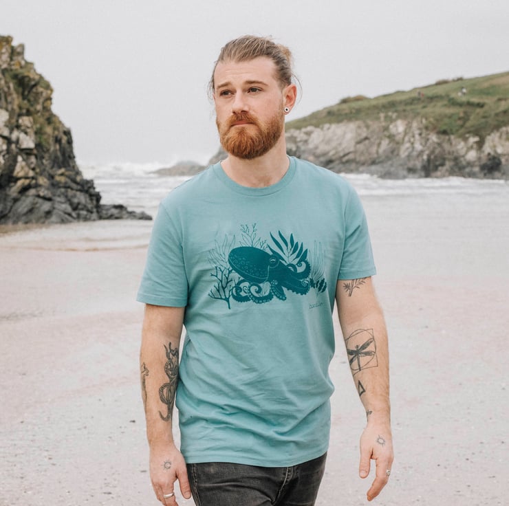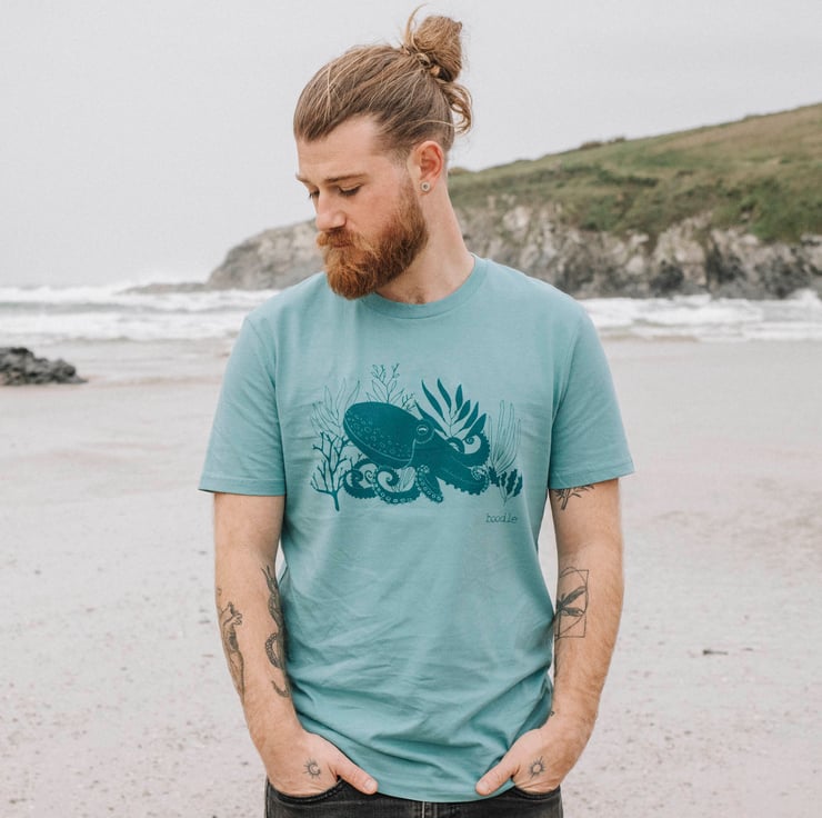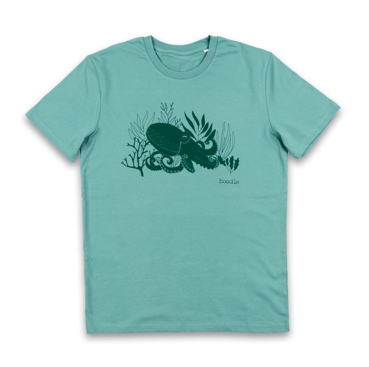 A lovely organic light turquoise T-shirt featuring a beautiful illustration of an octopus hiding in some sea weed.