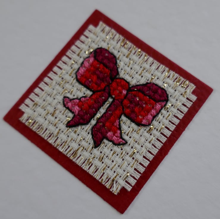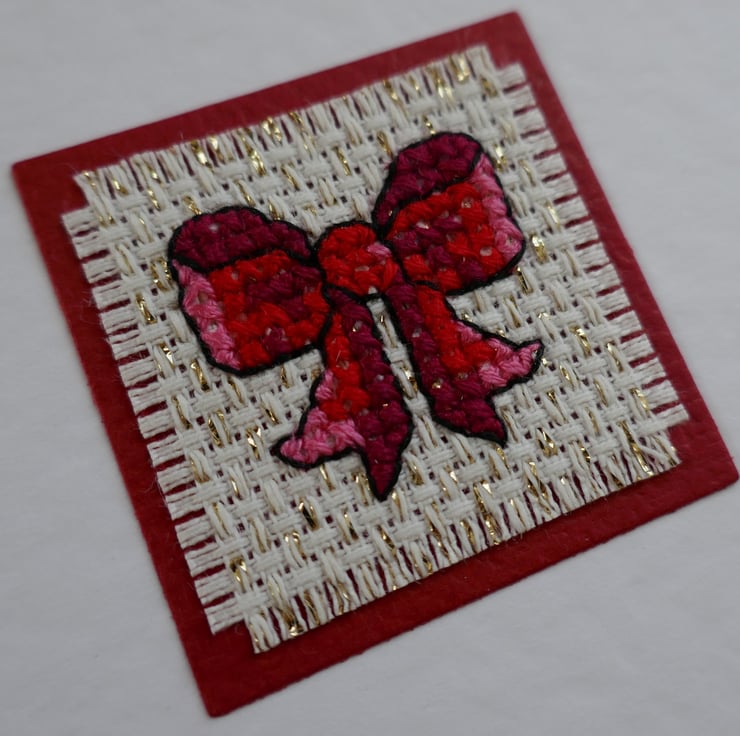 A small bow has been stitched on warm white aida which has a gold thread running through it - the fabric is approximately 3.5cm x 3.5cm and the edges have been frayed. Two shades of red and a pink thread have been used to stitch the bow and it has been outlined in black. This stitched panel has been layered onto a square of dark red card.