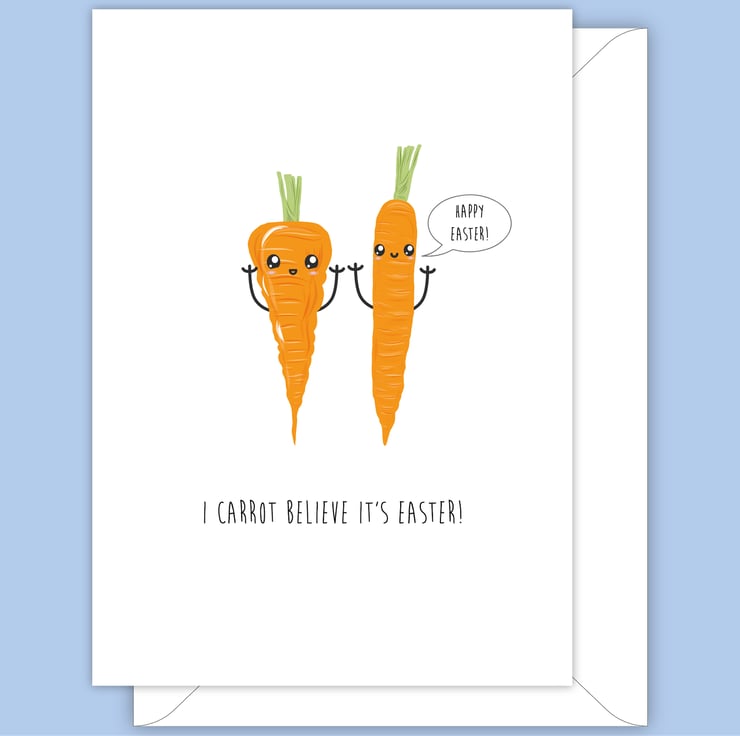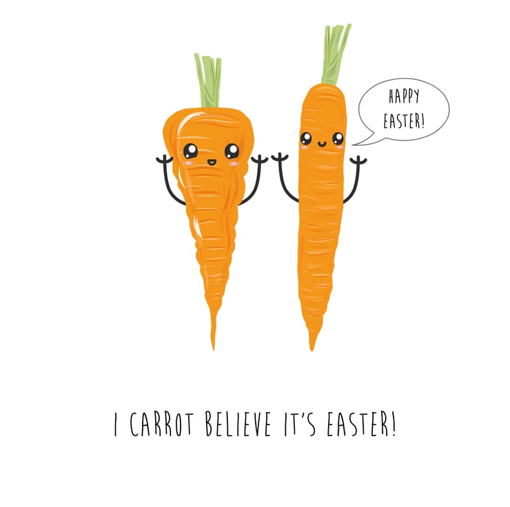 An A6 (folded) Easter card made with 350gsm FSC card depicting a hand drawn pair of carrots that look excited it is Easter and want to wish everyone a happy Easter. They both have happy cartoon style faces. The card is silk coated on the outside to make the image pop and matt on the inside so you can easily write your own message.