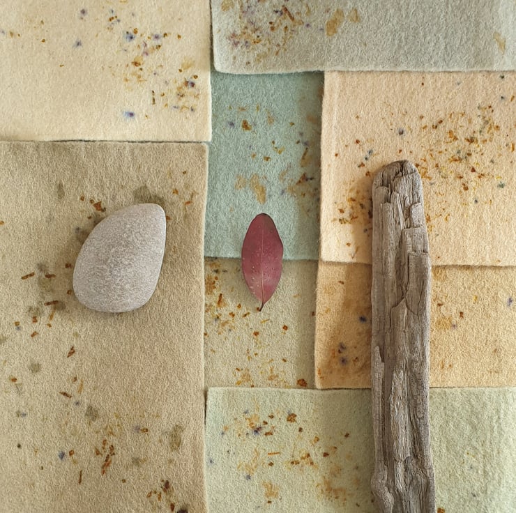 100% wool felt sheets in naturally dyed warm tones made from alder cones and sequoia cones, with speckles from onion skins, rose, hibiscus and tea.