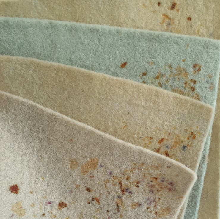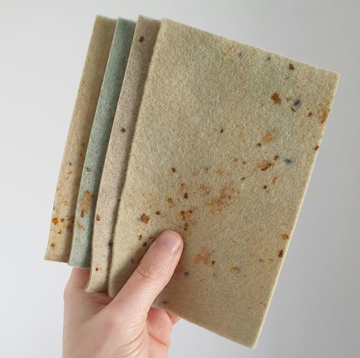 100% wool felt sheets in naturally dyed green tones made from nettles, alder cones and woad, with speckles from onion skins, rose, hibiscus and tea.