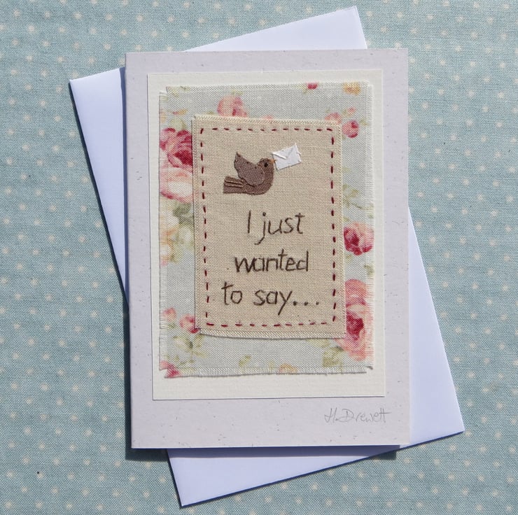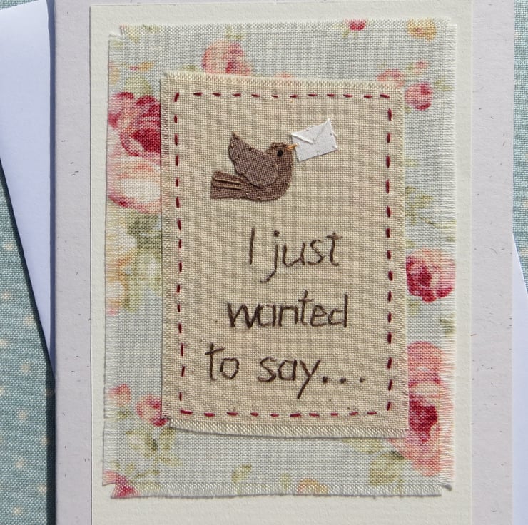 I have cut and hand-stitched a tiny applique bird with an envelope, winging her way to the recipient with your special message. I have stitched the words 'I just wanted to say...' below making this a card suitable for any number of special times.