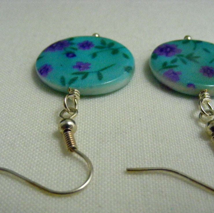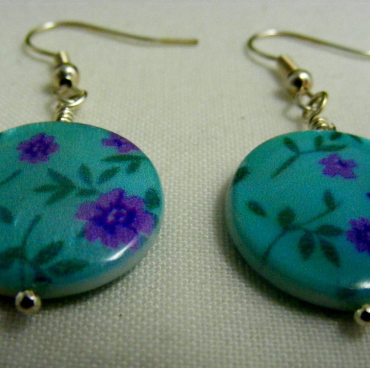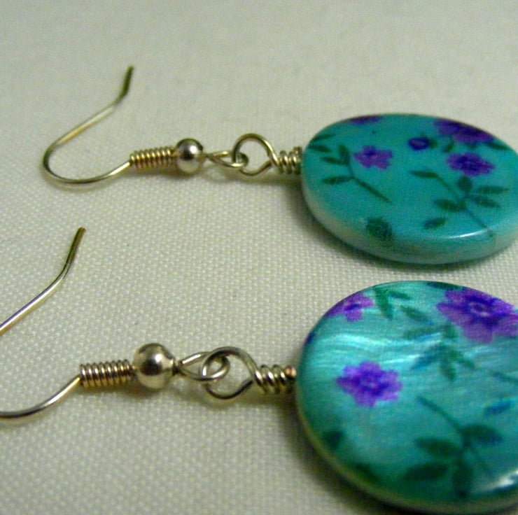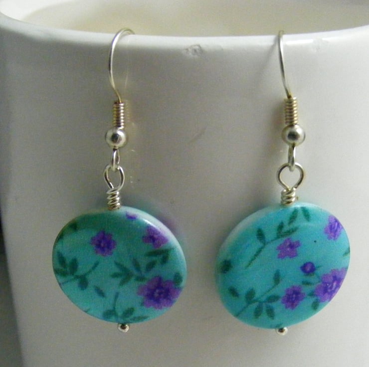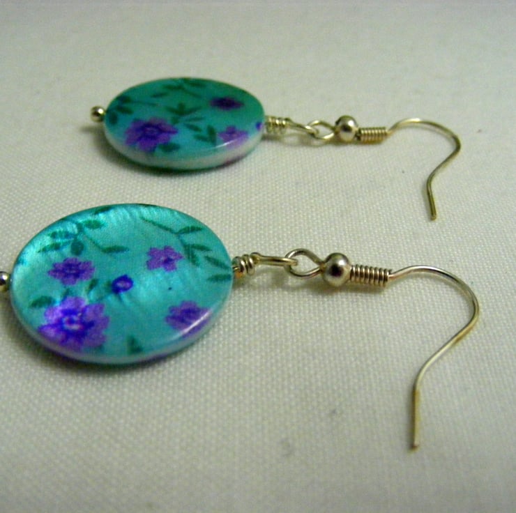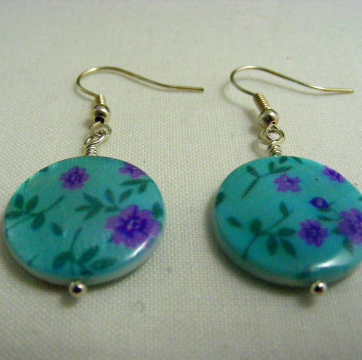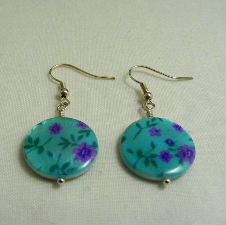 A lovely pair of dangle earrings handmade with, 20 mm MOP turquoise and purple flower coins, silver plated headpins and ear wires.