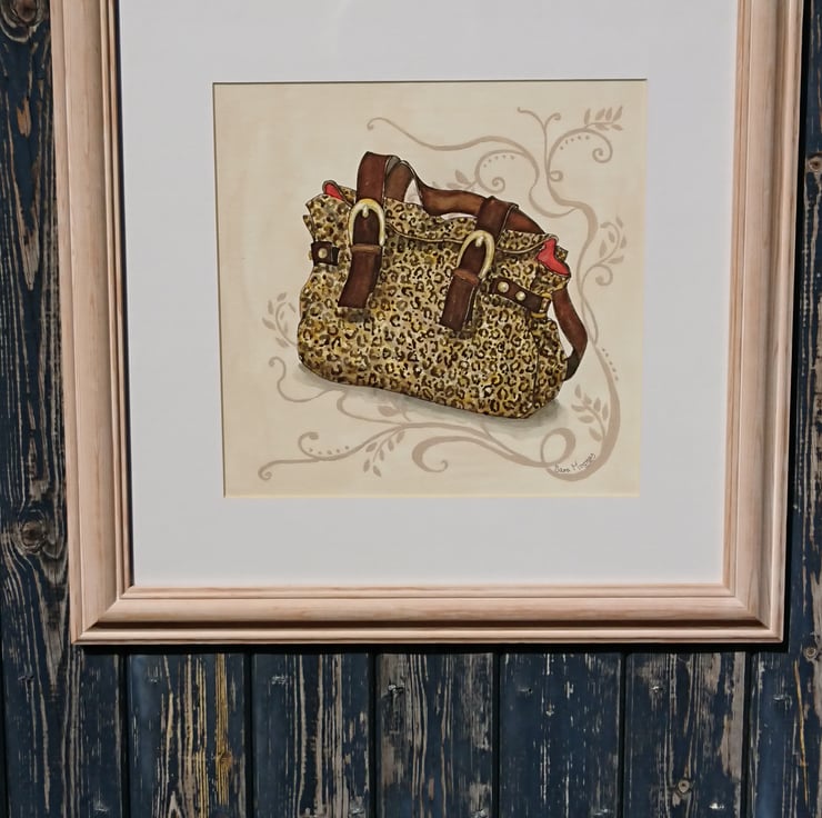 Handbag in animal print painting features a soft leather bag pulled in at the sides by brown leather gold studded straps. There is a fold over flap across the top showing a flash of red lining and the 2 leather shoulder straps have rounded gold coloured buckles. There is a decorative buff coloured scroll design on the cream background. I painted this in my Norfolk studio, it is mounted, elegantly framed in lime-washed wood and ready for you to hang. The overall measurement is 38cm sqaure and the internal image is 24cm square. Are you a handbag lover and an animal print fan, if so this one's for you! I call it 'Animal Print Handbag'.