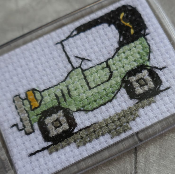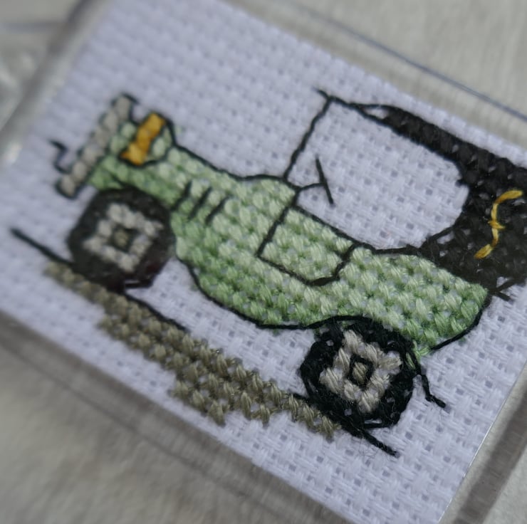 The vintage car is from a design by Mouseloft and has been cross stitched on white aida - the fabric is approximately 5.0cm x 3.5cm. It has been stitched in shades of light green, grey, yellow and black with black outlines. The stitching has been placed into an acrylic keyring with a piece of white textured card at the back of the stitching.