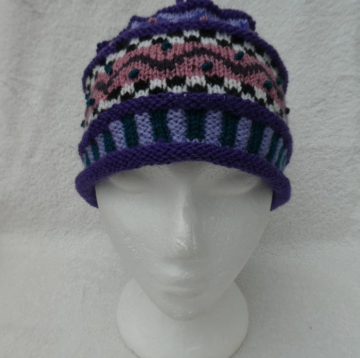 I have designed and hand knit this wonderful brightly coloured hat from double knitting weight premium acrylic yarn, using fair isle techniques. The hat has a roll up brim, 2 colour rib, garter ridges and fair isle panels. There are decorative French knots and an i-cord top knot to complete the hat. It is knit in the round, so there are no seams.