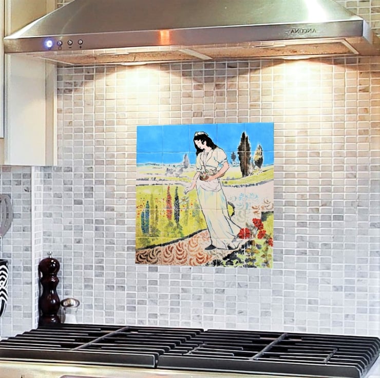 This hand-painted Ceramic Tile Backsplash features an art nouveau inspired female figure, walking through the perfect summer garden.