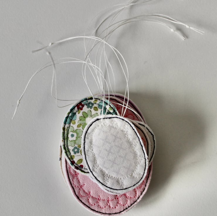 Each egg is sewn using 100% wool felt, cotton cloth and free hand machine embroidery; multiple layers of cloth are sewn together and cut out by hand using very sharp scissors. With a linen string to suspend.
