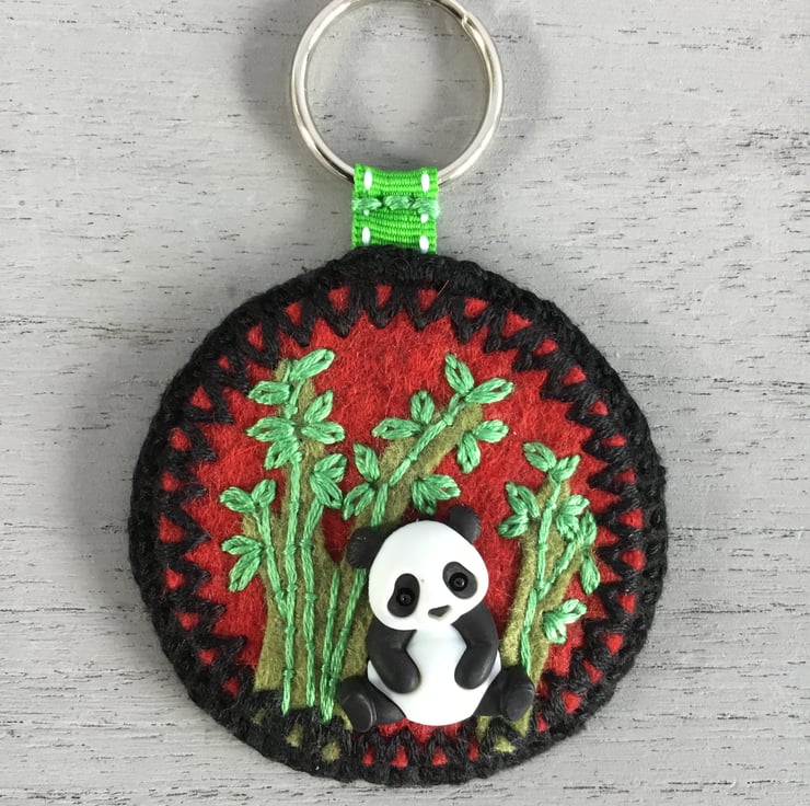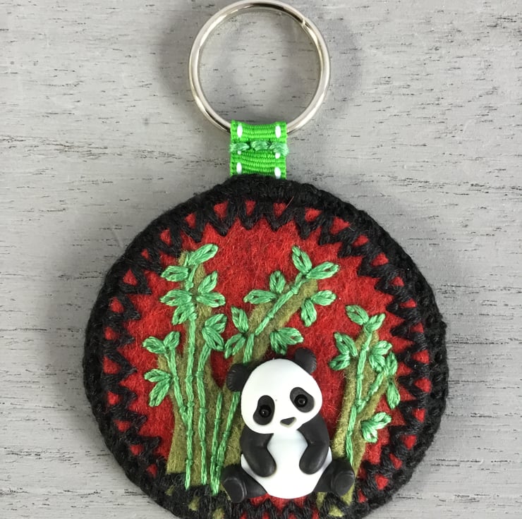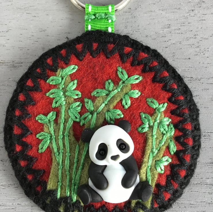 A cute panda sits amongst bamboo plants in this hand embroidered miniature scene ...... reminiscent of the natural habitat of pandas living in Asia. A character panda button is sewn onto a background of red and black felt, with hand embroidered borders in Scallop and Blanket Stitches in black thread. The green felt stems and leaves of the bamboo plants are hand embroidered in pale green Couch and Lazy-Daisy Stitches. Red is a lucky colour in Asian culture and it looks striking with the black and green embroidery stitches in this textile picture....making this a lucky accessory for a key or a bag.
