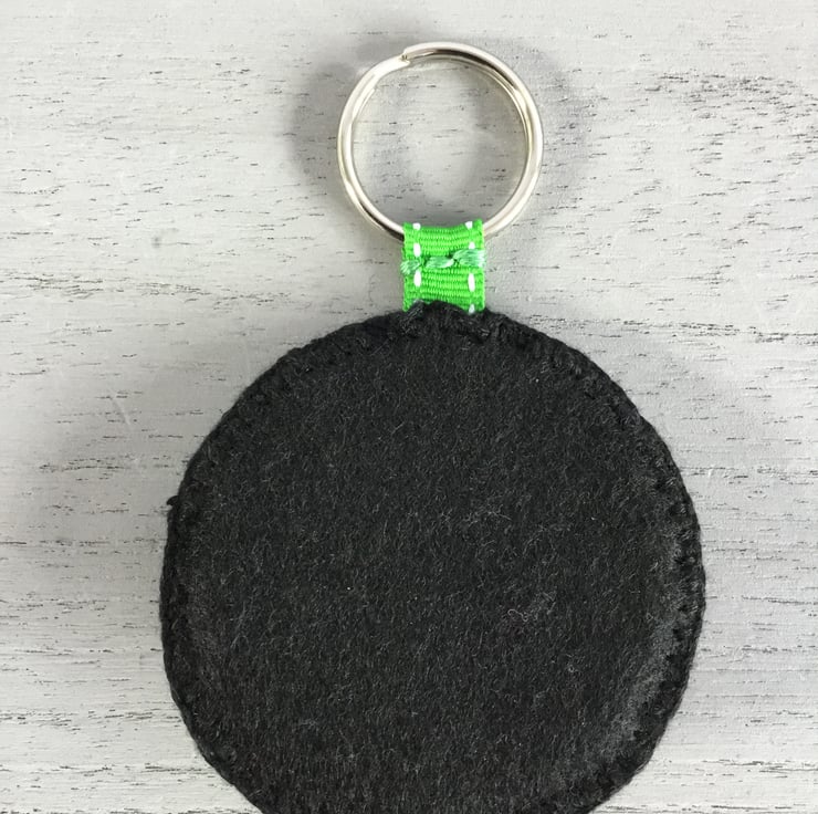 This circular textile Bamboo Panda accessory is 8 centimetres in diameter (2.5 inches) with a silver steel split ring securely attached at the top of the picture with a green and white ribbon, making it 10 centimetres in height. It’s ready to attach a key, to accessorise a bag or to put on a belt.