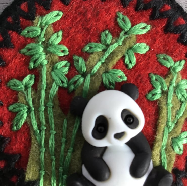 I really enjoyed hand embroidering this lucky Bamboo Panda scene in red, green and black felt and threads. It’s ready to pass it’s luck on........