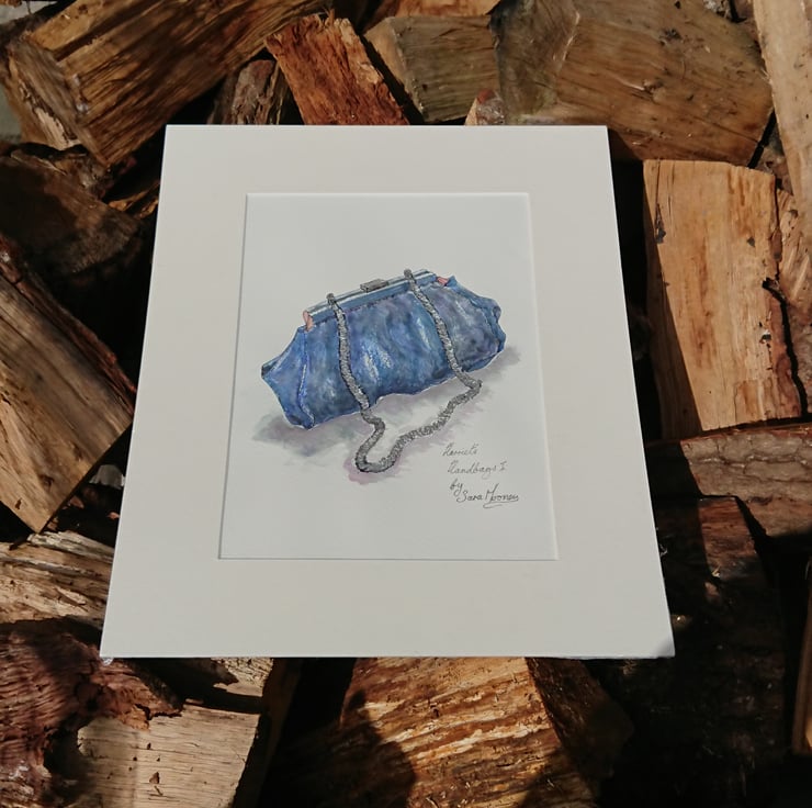 Blue silk handbag painting features an elongated shimmering silk fabric evening handbag with stitched detail. There is a silver metallic shoulder chain and rectangular clasp on the rigid top bar and a glimpse of pale pink lining. The background has been left white with some shadowing at the base of the bag. I painted this in my Norfolk studio. It is mounted and sealed. The overall measurements are 38.5cm x 31cm and the internal measurement is 26.5cm x 19cm. I have called this one 'Harriet's Handbags I'.