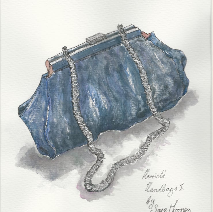 I have a background in fashion and textiles so I always relish the opportunity to create a fabric effect. In this case I wanted to convey the shimmering yet soft silk fabric. The metallic paint added an extra texture. This is a handbag shape I have seen somewhere so I sketched it from memory. My daughter has the other bag in this pair so that is why I have called this one Harriet's Handbags as well.