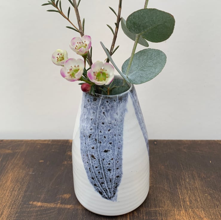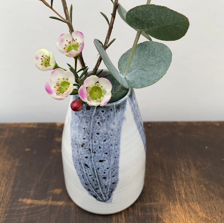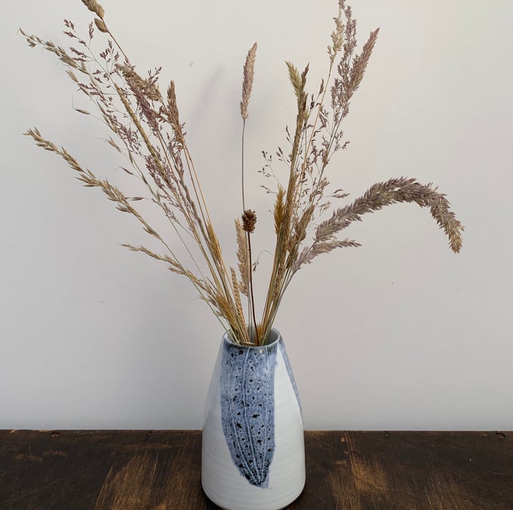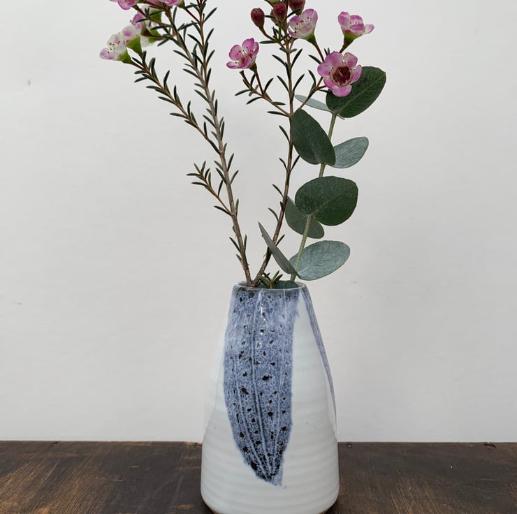 After they have been thrown and trimmed I paint brushstrokes of slip downwards from the rim. With this vase I then scratched through the slip to create an impression of leaves. The vases are then left to dry completely before their first firing in the kiln. Some of the vases have had their rims manipulated to make them oval shaped.