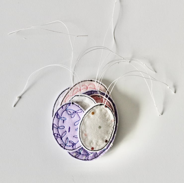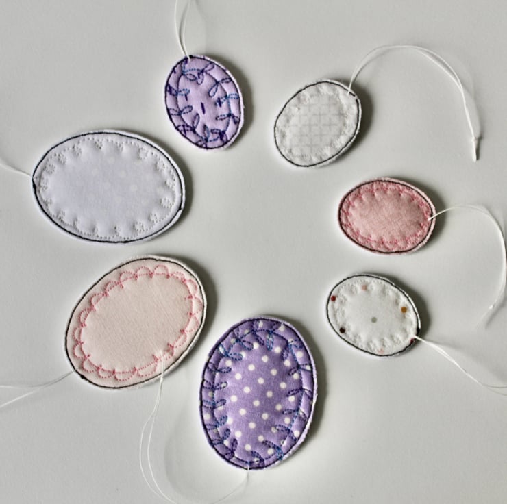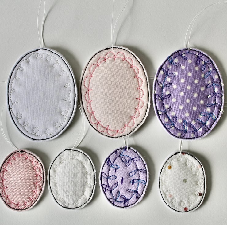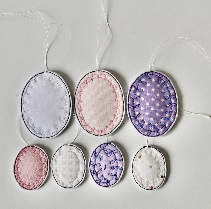 Each egg is sewn using 100% wool felt, cotton cloth and free hand machine embroidery; multiple layers of cloth are sewn together and cut out by hand using very sharp scissors. With a linen string to suspend.