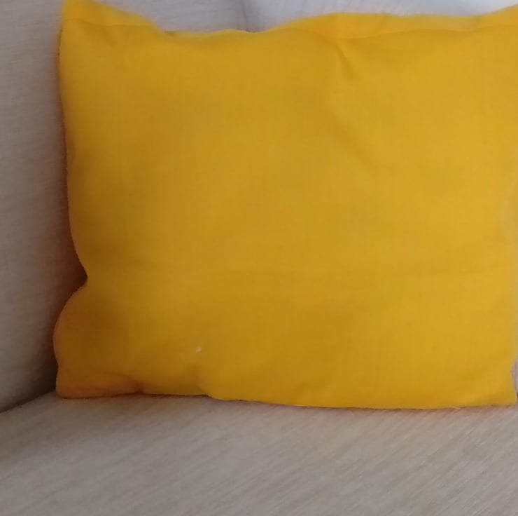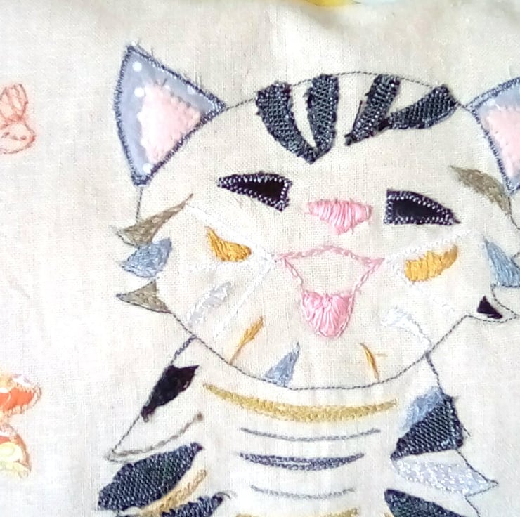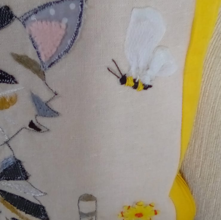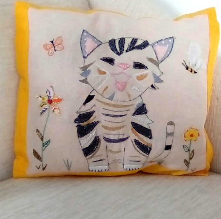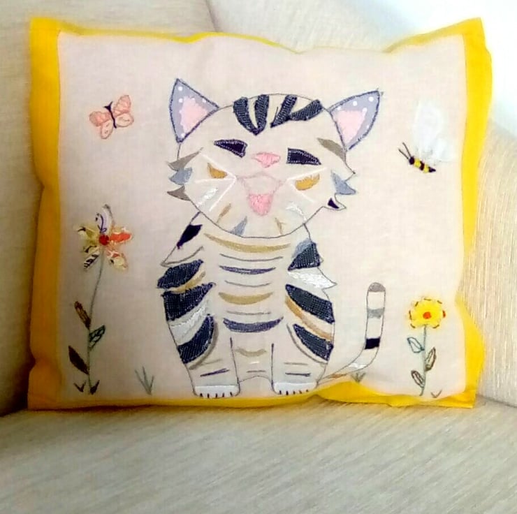 I have hand embroidered this sweet cute kitten onto a Linen background. I have also then appliqued a mix of fabrics to create the fur. All the flowers and bees are hand embroidered. The edging and back of the cushion are of bright Yellow cotton. Fastens with a zip.