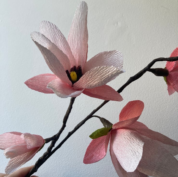 A beautiful pink magnolia branch available in 2 sizes, made from crepe paper, wire and wood. Capture the fleeting beauty of the real tree all year round! The smaller size is approx 35cm with 3 flowers and 2 buds. The larger size is approx 45cm with 4 flowers and a bud.