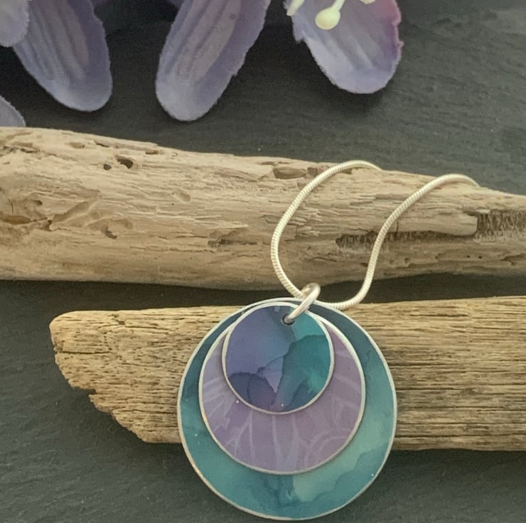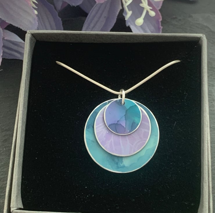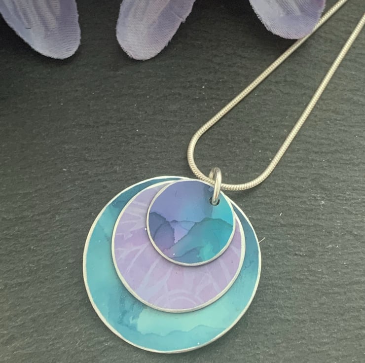 The pendant is made with 3 layered discs. Each layer has been hand painted. The larger lower disc is a two tone teal/blue. The middle layer is lilac with a subtle butterfly wing print and the top layer is teal and purple.