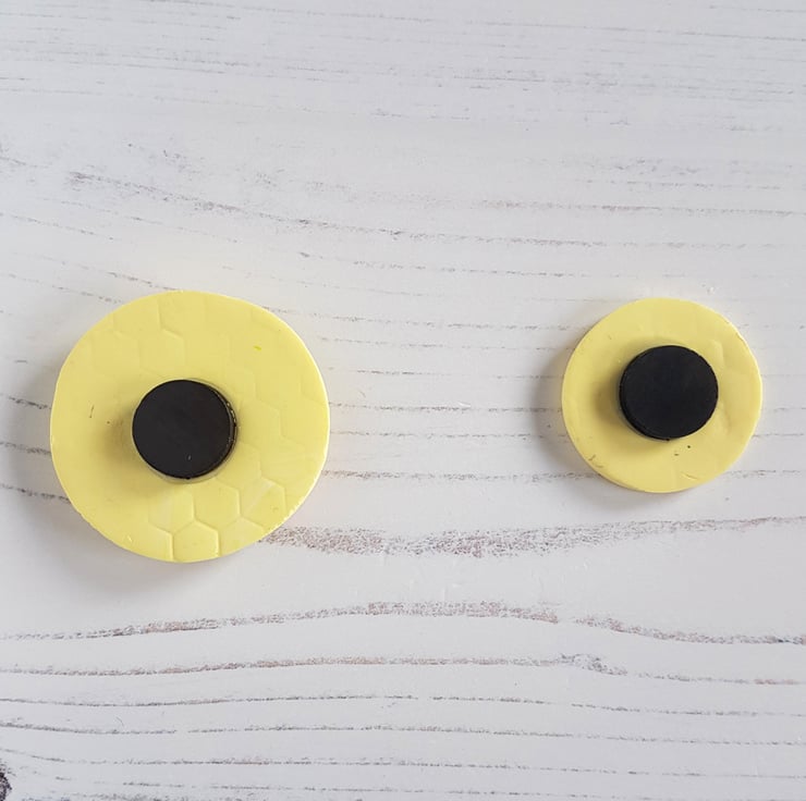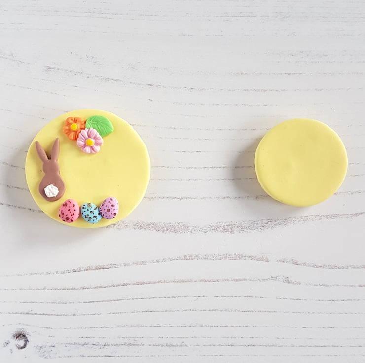 Hand made by myself using polymer clay, approximately 4cm in diameter for the top disc.