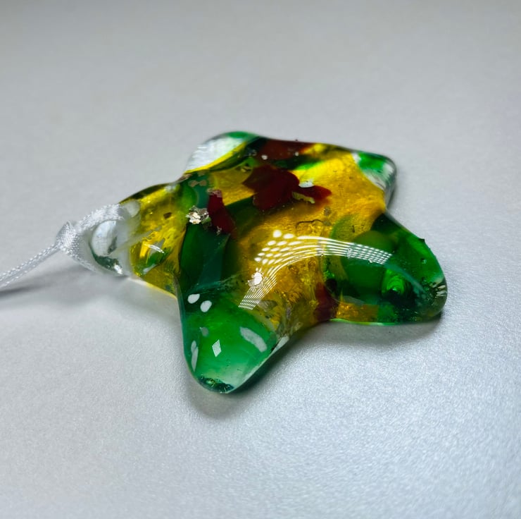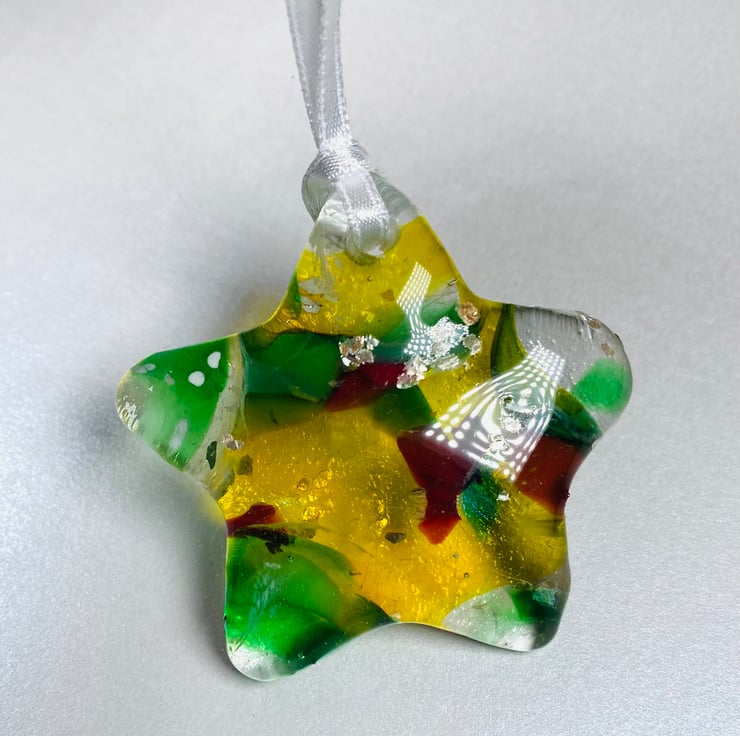Fused glass cast star glass hanging decoration . A perfect little gift to tell someone they are a star . Could be exam success, surviving illness, graduation or just for being a special person.