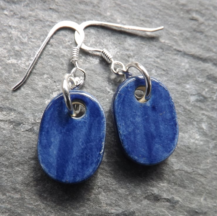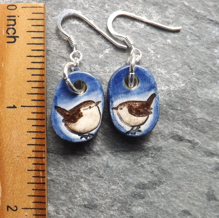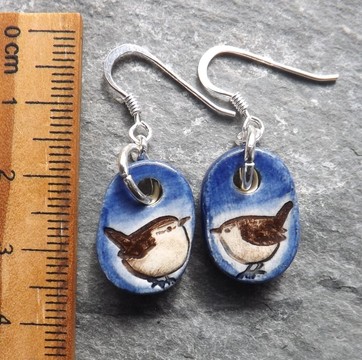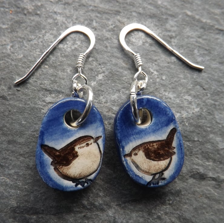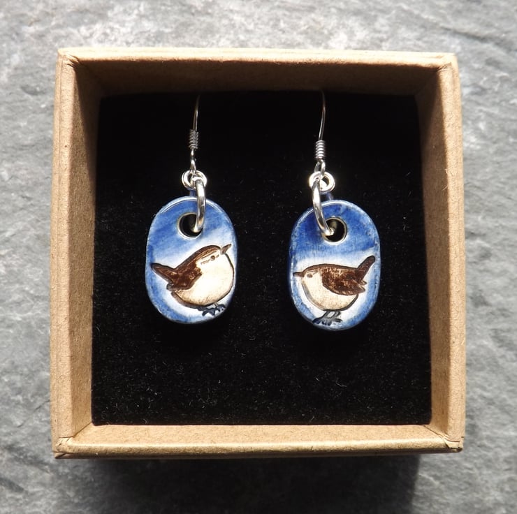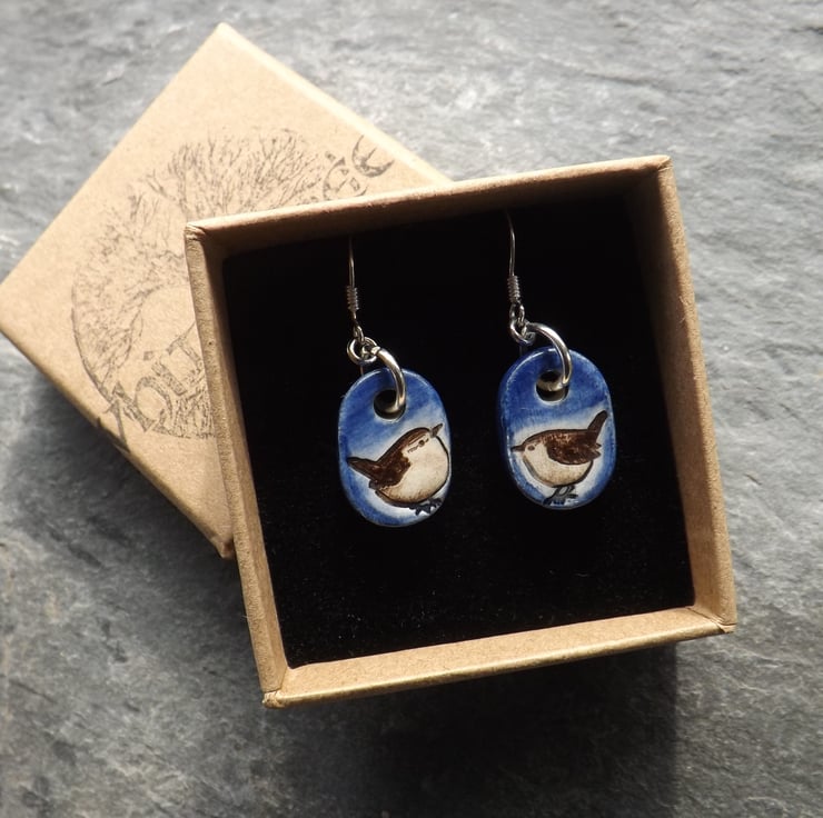 These earrings feature a pair of dapper little wrens that have been painted brown with deep blue over the background. As with all my jewellery they are made and decorated entirely by hand.