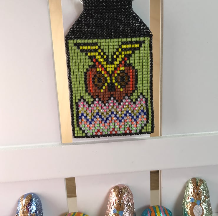 Beautiful loom beaded wearable art pendant suspended from an unhallmarked 60cm (24") 2.5mm Sterling Silver Belcher chain.