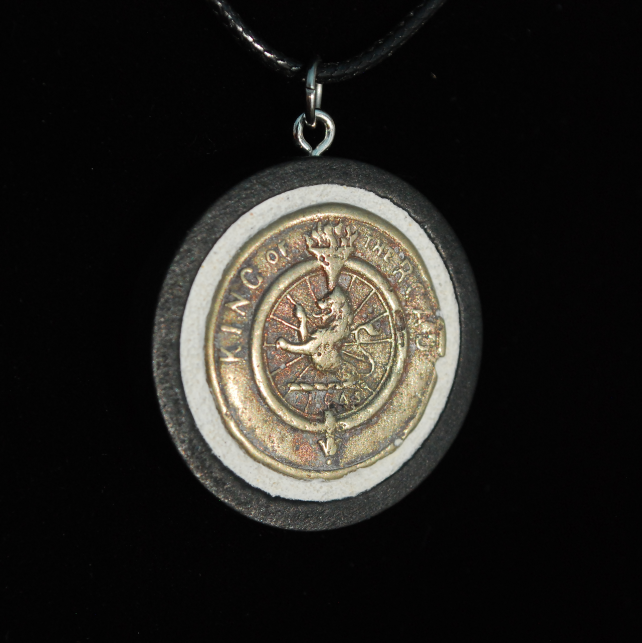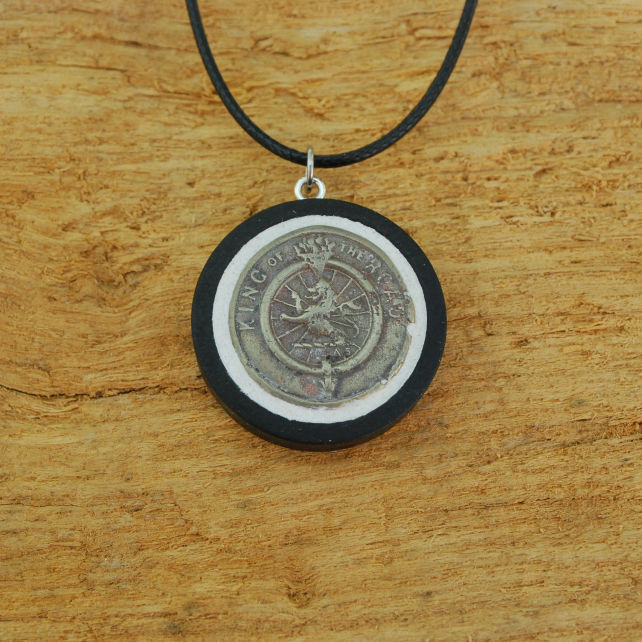 We've made this amazing pendant from a metal object we found on the beach. It is from a Lucas King of the Road product, possibly from a car horn or lamp. To make it into a pendant we have backed it with a black painted wooden mount. The medallion is embossed with a lion and the text "King of the Road", and there is a flaming torch above it. This is a fascinating and absolutely unique pendant. We've hung the pendant on a black cotton cord to match the wood, but we can replace this with a silver chain if desired.