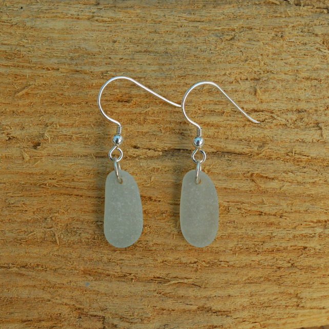 We've used wonderfully matched, perfectly frosted pieces of sea glass to make these lovely earrings. The glass has come from old pale aquamarine bottles. This was the colour used before white glass could be make cheaply. To keep the beautiful simplicity of the glass we've mounted them on pretty sterling silver ear wires.