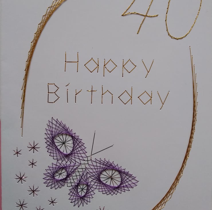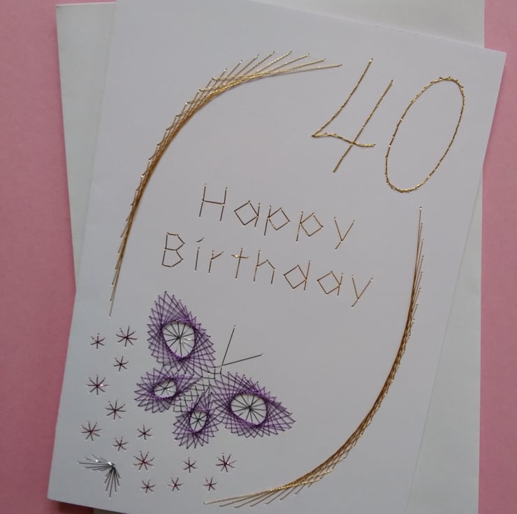A lovely card for that special birthday. Hand embroidered in silver, gold, pink and mauve metallic thread on a white card. The pink insert has been left blank for your own message.