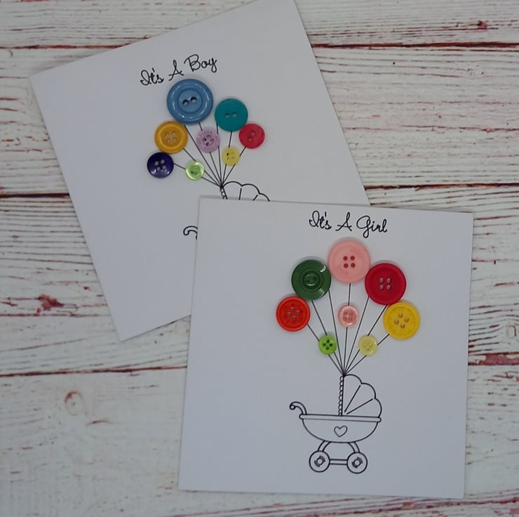 A hand-drawn pram lifted by multi-coloured button balloons to add a splash of colour, this simple card is the perfect way to send love and best wishes.
