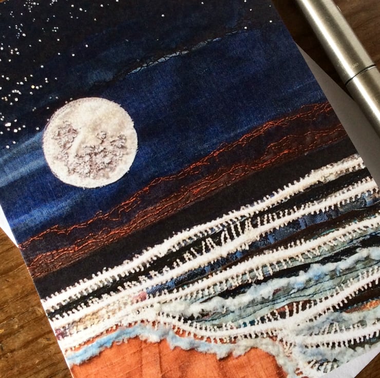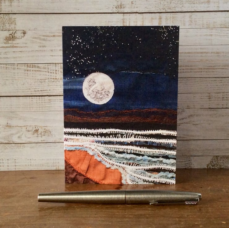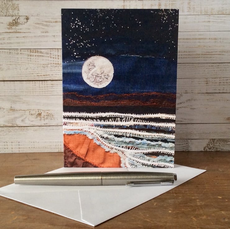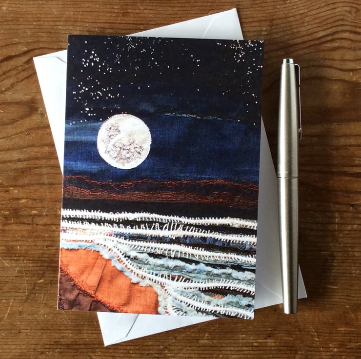 This dramatic card shows a full moon over the sea. The moonlight reflects on the waves and stars twinkle in the sky. The card is blank inside making it ideal for any occasion and it comes with an envelop in a plastic packet to keep the card clean. The card is A6, which is 10.3 x 14.7cm.