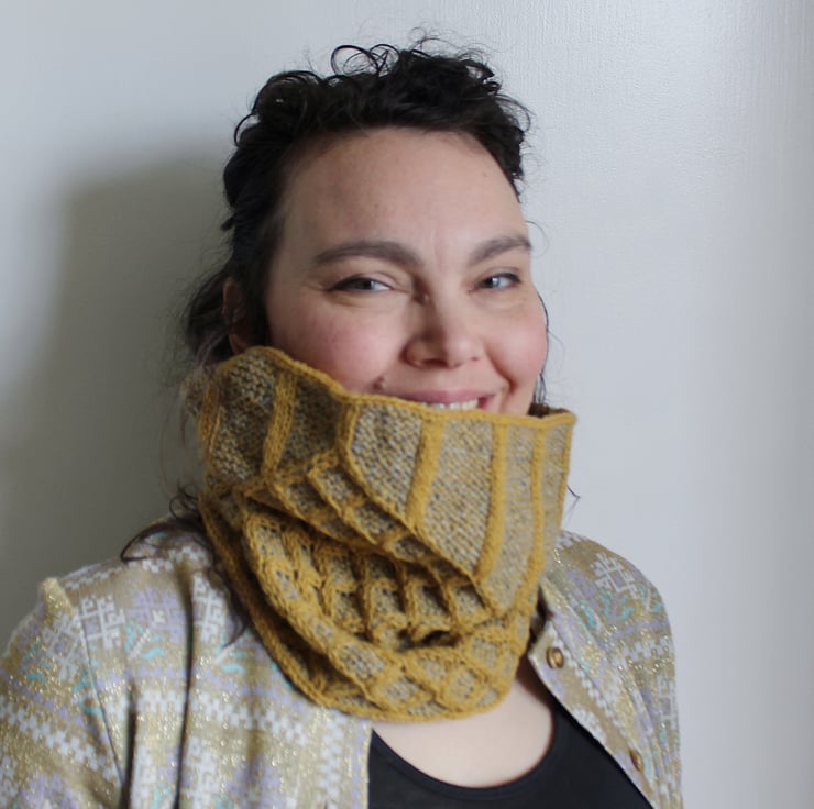 A light but cosy textured cowl with 4ply-weight yarn from Jamieson & Smith, in colour combinations hand-picked by Maddie.