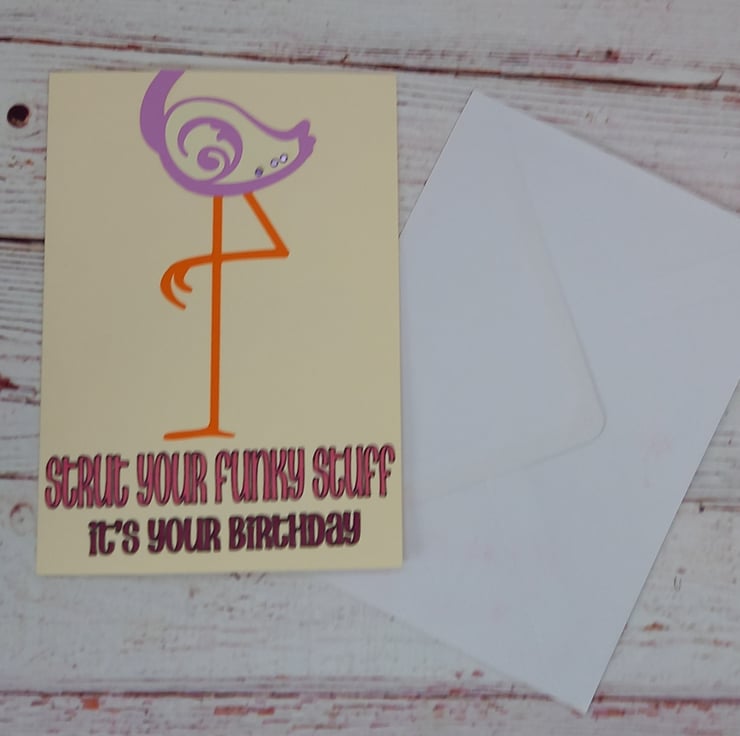 Bright, elegant and with a touch of sparkle, this card features the stunning long legs of a flamingo, the most beautiful bird in the tropics... With the words 'Strut Your Funky Stuff' boldly written across the bottom of the card it is sure to put a smile on the recipient's face this Birthday!!!!