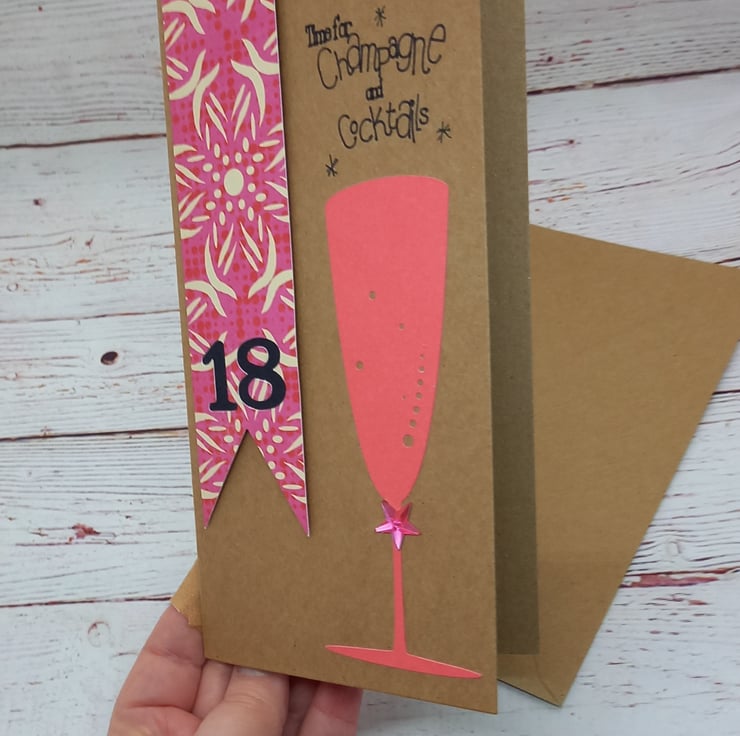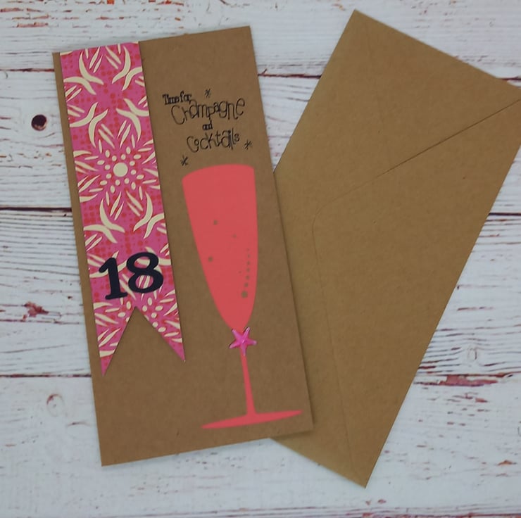 Featuring a banner with the selected age boldly cut out and a matching champagne glass, this card declares 'Time for Champagne and Cocktails'