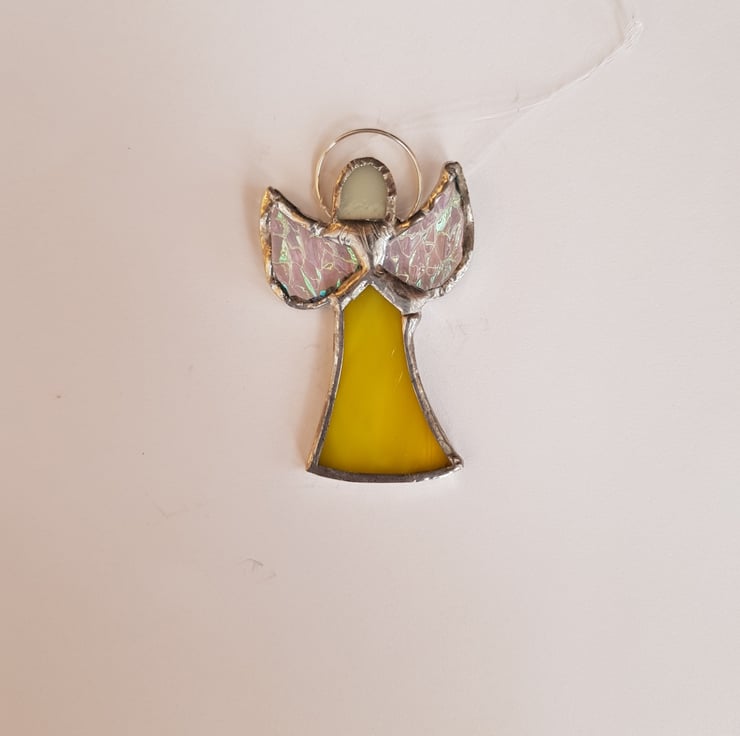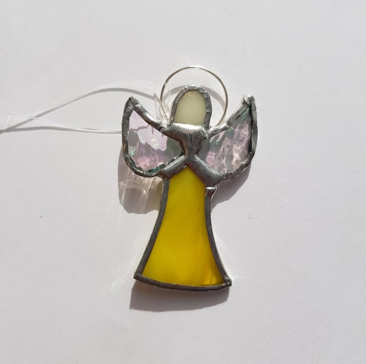This small skirt angel is made using yellow, cream and clear, textured, iridised glass with a ring and invisible thread for hanging.