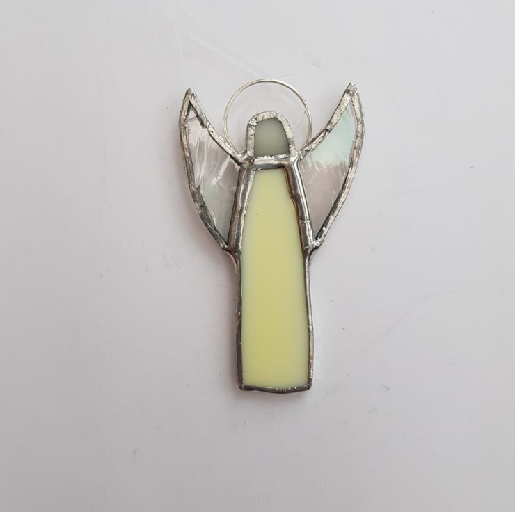This small thin angel is made using pale yellow, cream and clear, iridised glass with a ring and invisible thread for hanging.