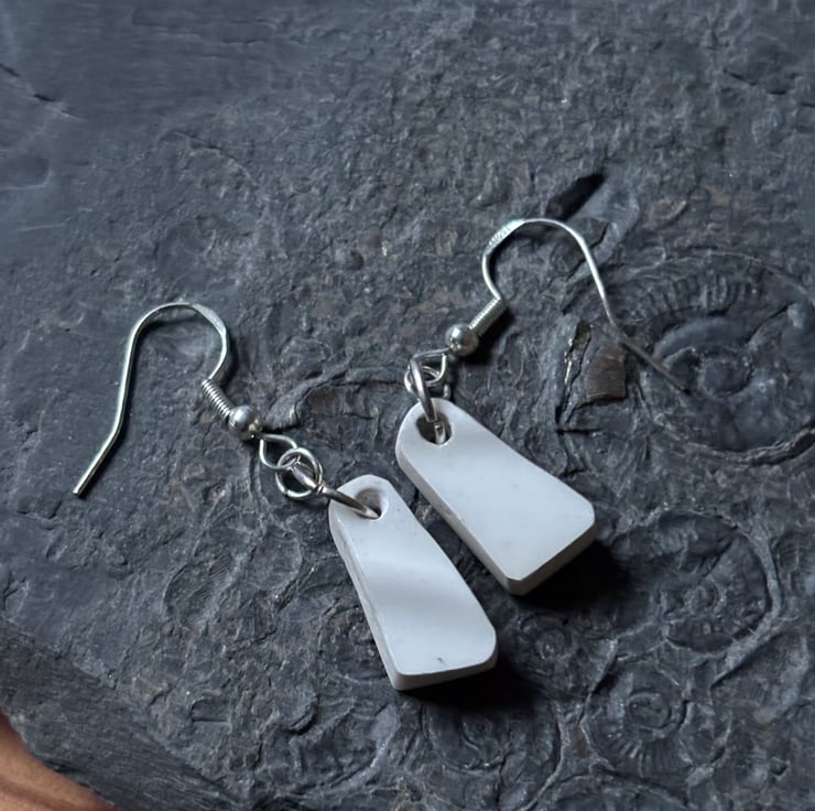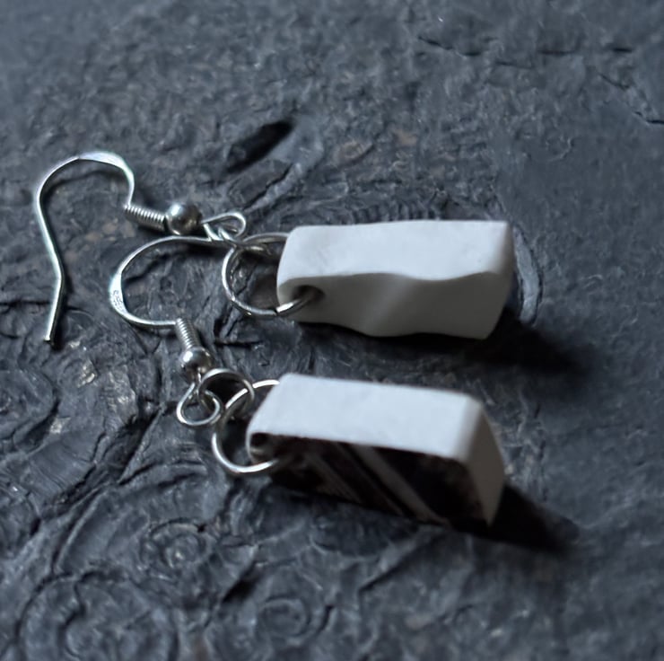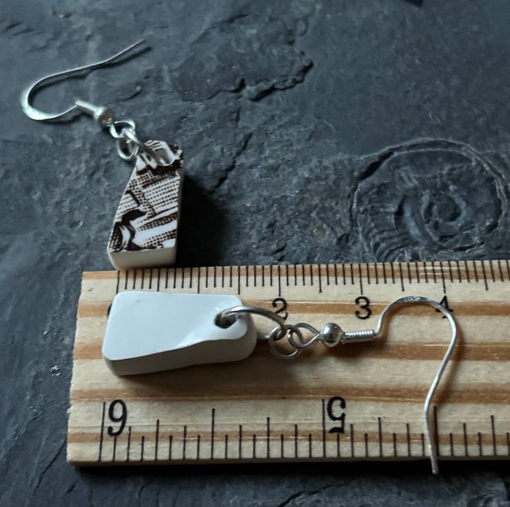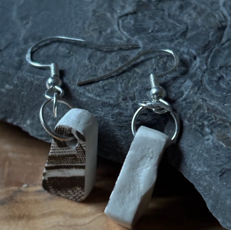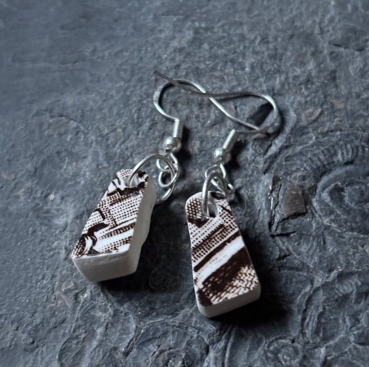 I clipped the plates with a small tile cutter and allowed shapes to form naturally. A lot of shards were formed, all sorts of sizes and thickness. These earrings are made from shards created from the stand ring of a large brown patterned plate. The glaze is in tact and although not the same they are alike in shape and come from the same area of the plate.