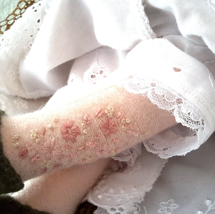 Her eyes and mouth were hand embroidered and she is adorned with floral embroidery to her face and limbs in delicate pinks.