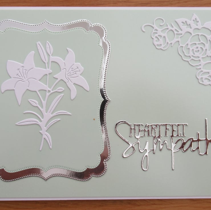 A simple card featuring white die cut lilies sat upon pale green card which has been cut using a decorative rectangular die. There is a silver mat behind, creating a framed effect, a die cut rose in the corner and the words Heartfelt Sympathy, which have been die cut using silver mirror card. The inside is finished to coordinate, with another die cut rose in the bottom corner, but has been left blank for your own message.