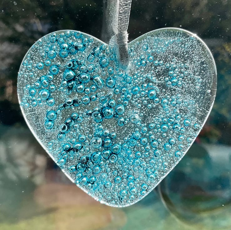This handmade fused glass heart, looks beautiful hanging in a window. It would make an ideal gift for friends or family. It is made by cutting small pieces of bullseye glass and fusing them together in my kiln. It is then ground to smooth the edges and re-fired to polish the surface. Each one is completely unique and one of a kind.