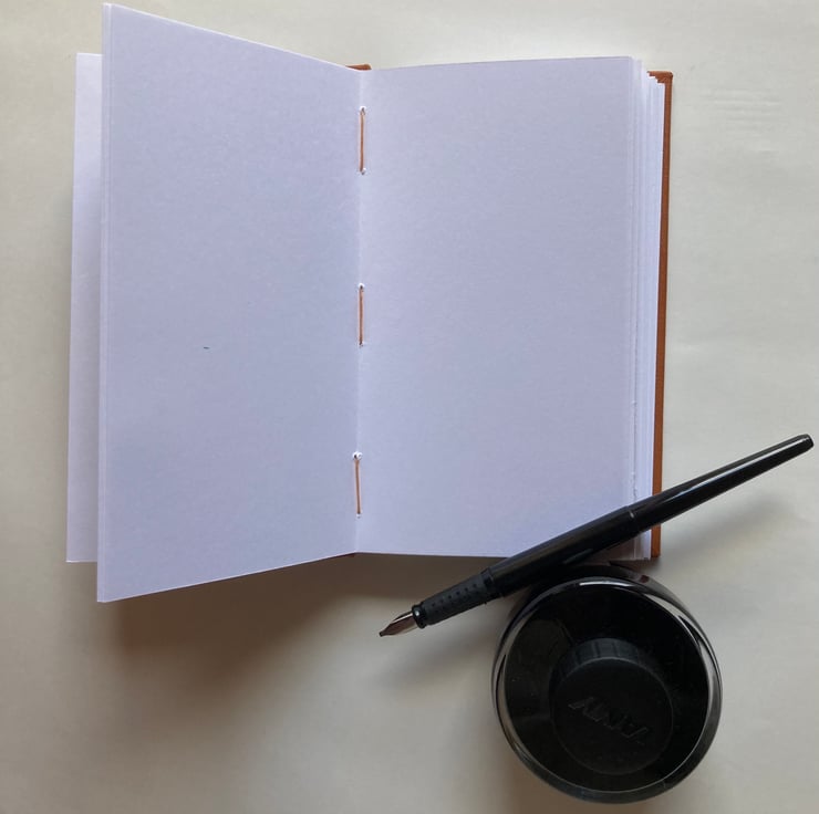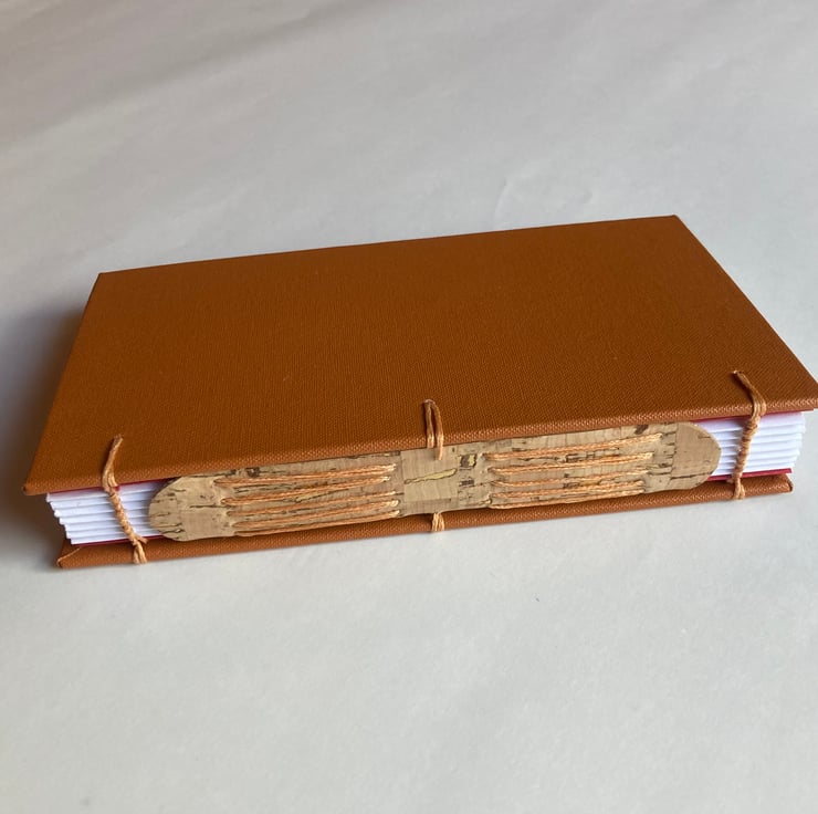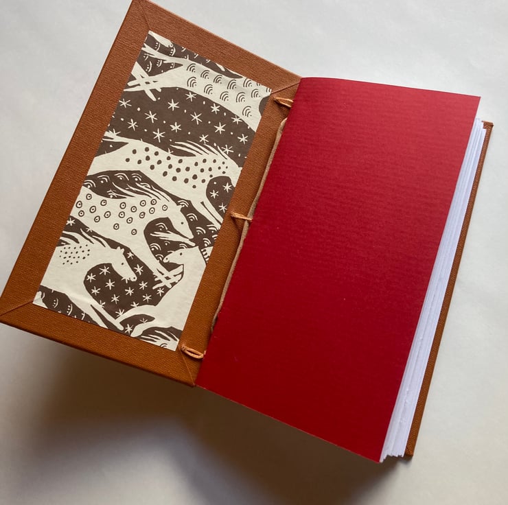 Slip this little journal into your pocket or bag for when you are out and about and want to keep a record of your observations. Whether you are bird watching, identifying wildflowers or jotting down your thoughts about the landscape, this journal could come in very handy. Covered in tan-coloured bookcloth with a cork (vegan leather) spine, this journal has 72 leaves (144 pages) of good quality white paper and endpapers of plain red and of brown & white wild horse design (from Cambridge Imprint).
