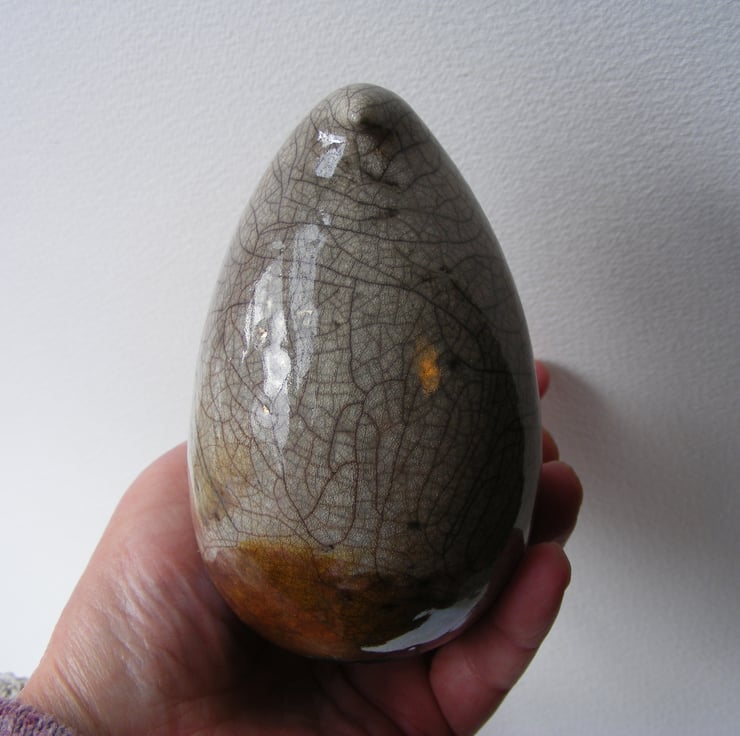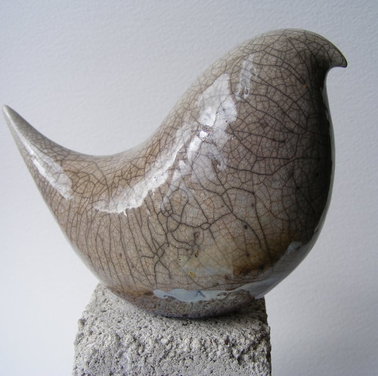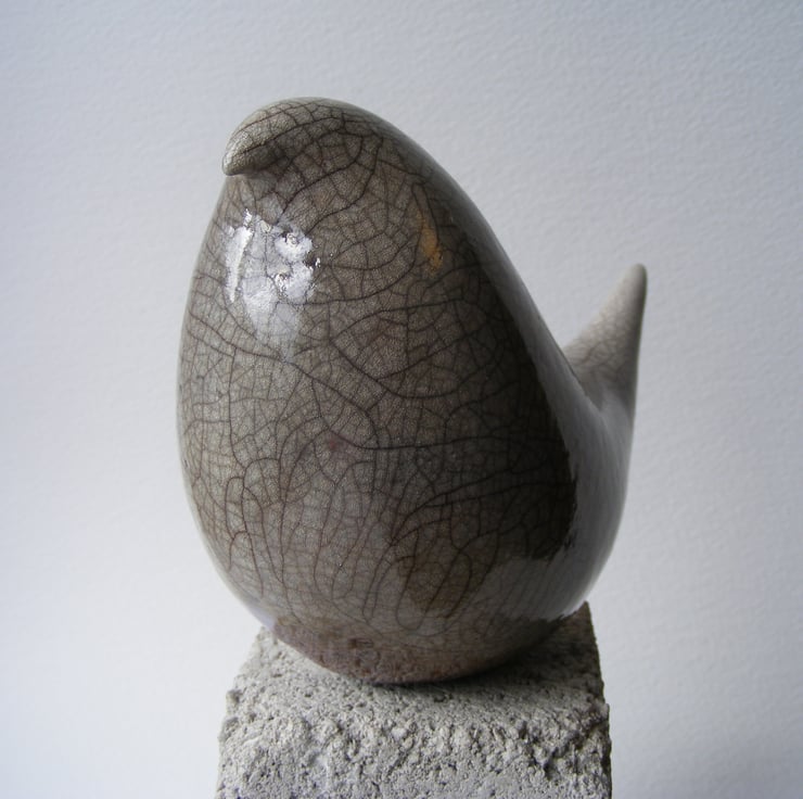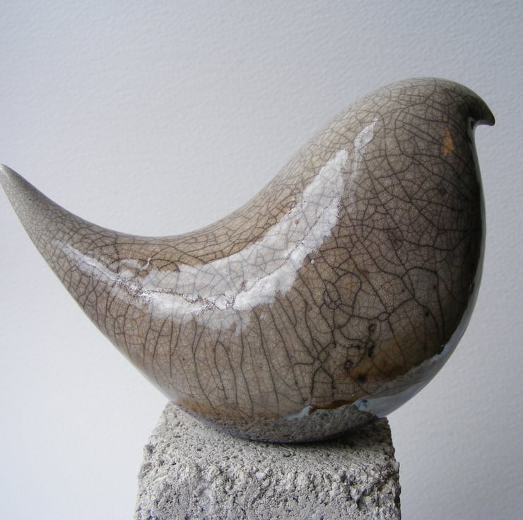 This bird is hand made and measures approx. 9cm high and 12cm long. I modelled the bird shape first and made a rough mould, It is press moulded using stoneware clay and burnished before being dried and fired in an electric kiln, I then paint on 4 layers of clear raku glaze coloured with silver nitrate oxide. It is then fired again in a gas kiln, then at about 1,000 degrees centigrade it is taken out, this massive change in temperature causes the random crazing in the glaze then it is smoked in a container with sawdust, and any cracks in the glaze are turned black, this bird does have some gold flashing near the base, see pic. 4.