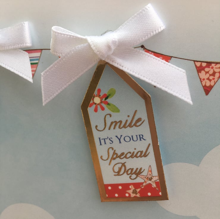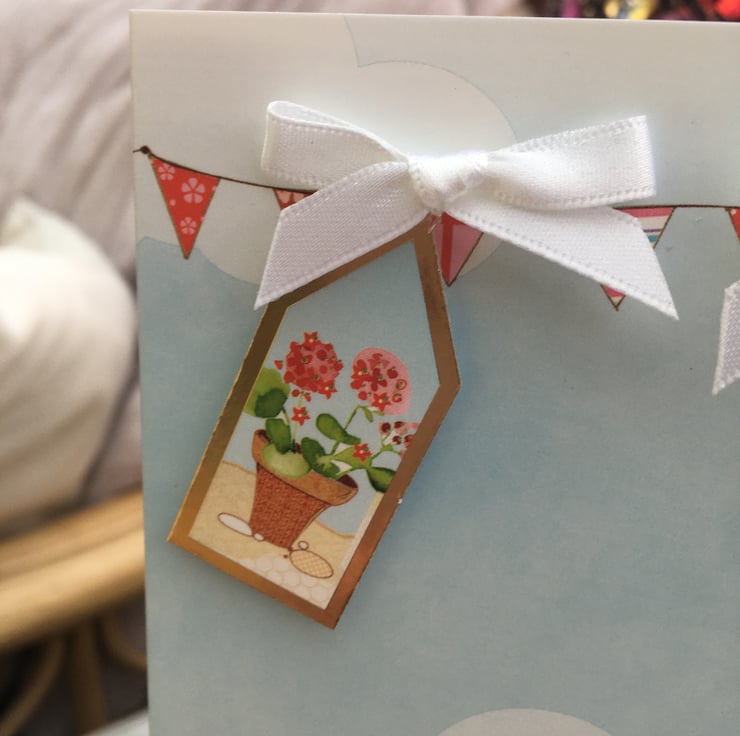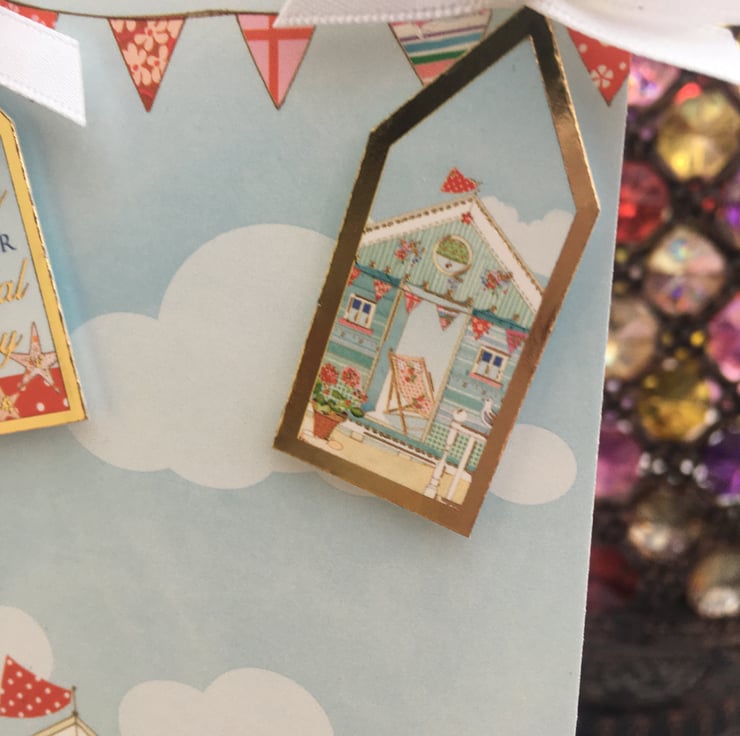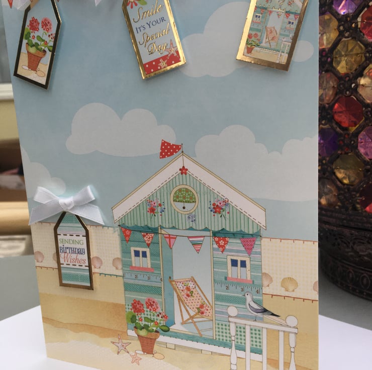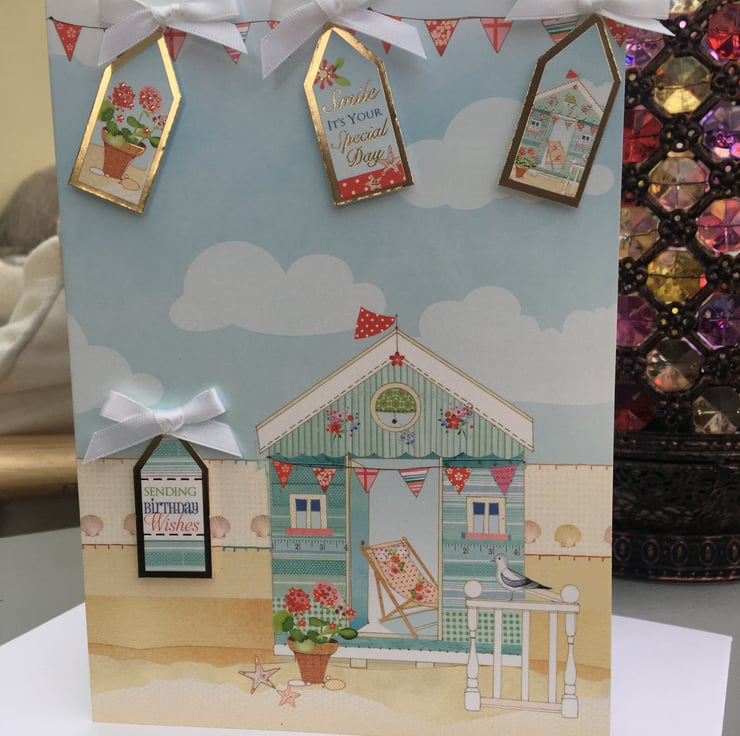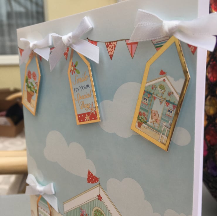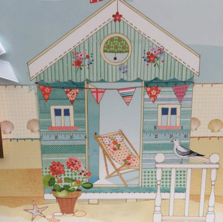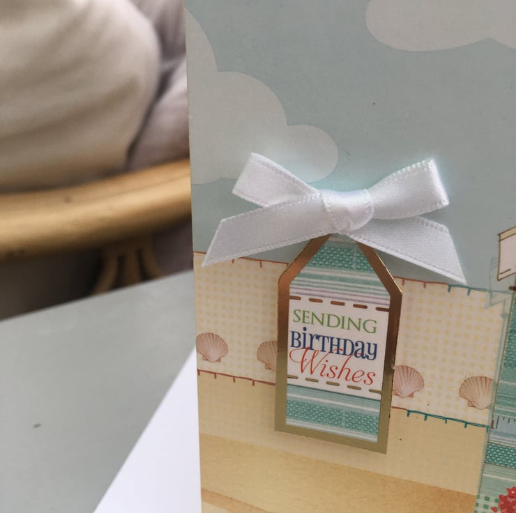 It will soon be summer, this is a fresh and fun card to celebrate a birhtday. A stylised beach scene with a quirky and fresh beach hut. The card is approximately A5 in size and shows a bright blue sky with white fluffy clouds. Golden sands have a beautiful bech hut on it. The beach hut has a haberdashery theme with a tape measure, stitching, fabrics and bunting. Bunting adorns the top of the card and has tags on ribbons hanging from it. A tag has the greeting Sending birthday wishes.The inside of the card has an insert which says May your day be filled with lots of love and happiness.